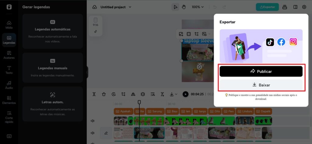 Assim que seu vídeo estiver pronto, basta clicar em Exportar. O Pippit facilita a escolha do formato, resolução e proporção ideais para Facebook, Instagram, YouTube Shorts ou TikTok. Você pode salvar o arquivo no computador ou fazer upload direto para as redes sociais usando o recurso integrado.